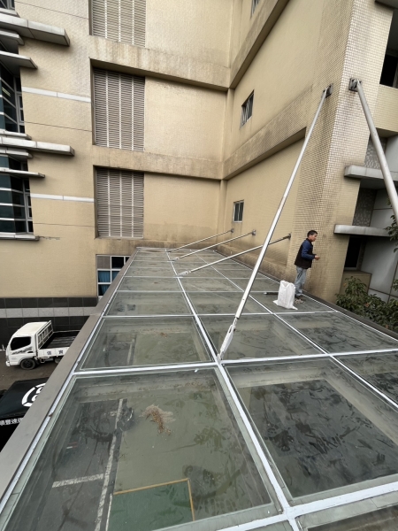 本工程施作玻璃採光罩,採用強化安全玻璃或膠合玻璃,玻璃規格、厚度及尺寸依設計圖說規定辦理。施工前須確認支撐結構尺寸、水平度及固定強度,並確保排水坡度符合設計需求。玻璃安裝時應以金屬框架及專用固定件固定,接縫處施作防水矽利康及防水處理,以防止滲水。施工完成後須進行防水測試與整體檢查,確認玻璃固定牢固、表面完整,並符合結構安全及採光需求。